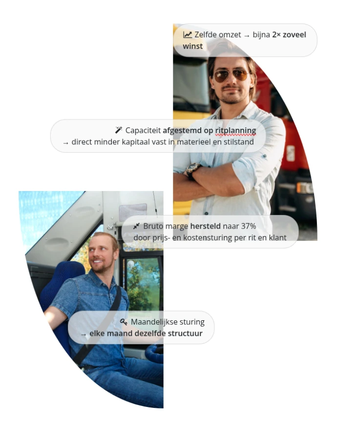 Naast de dagelijkse operatie wordt er actief gestuurd op groei, rendement en keuzes rondom capaciteit, tarieven en inzet die je transportbedrijf structureel sterker maken.